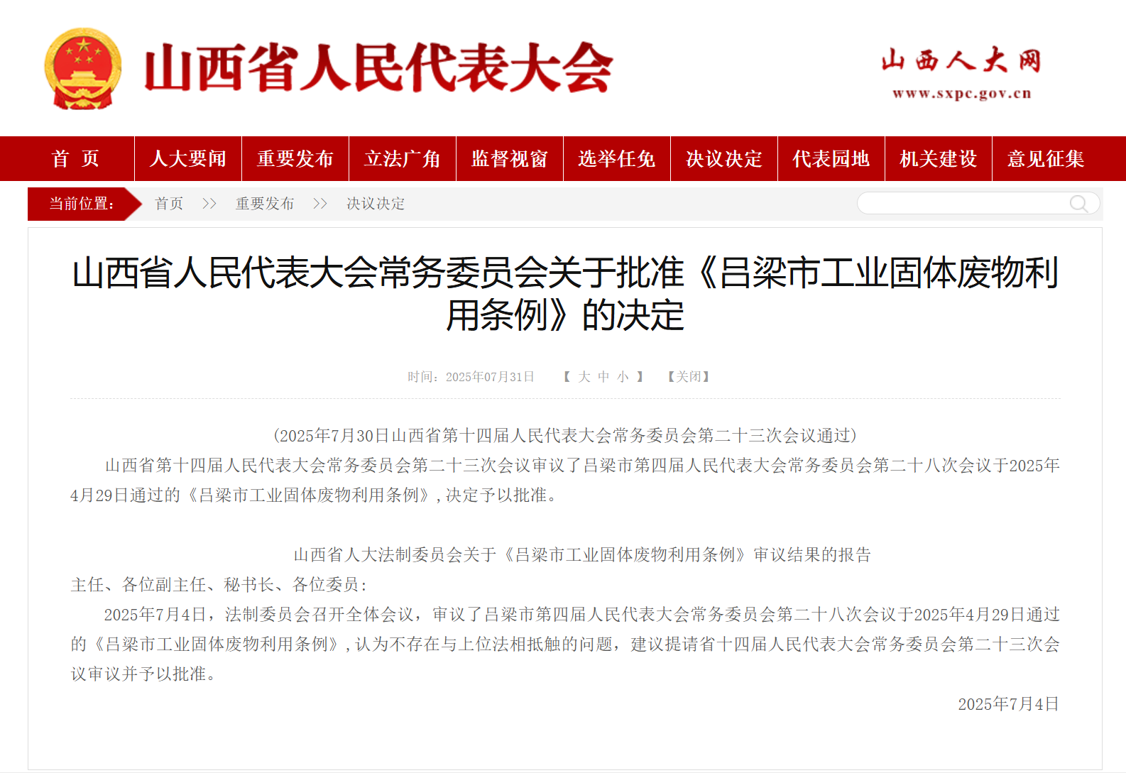 让工业固废“变废为宝”,是提高资源利用效率、缓解资源短缺的有效手段,推动固废利用法治化是重要保障。2025年7月30日,山西省第十四届人民代表大会常务委员会第二十三次会议决定批准《吕梁市工业固体废物利用条例》。该条例的论证和起草是吕梁市人民代表大会常务委员会委托雷兰教授的立法咨询项目。在项目实施过程中,雷兰教授带领团队成员深入了解固废处理和资源化利用技术,经过多方调研,精准把握企业的实际需求和现实困难,充分评估论证可行性和经济性,以“求极致”的专业精神高质量完成了各项研究任务。该条例自2025年9月1日起施行,为促进工业固体废物利用产业创新发展、推进工业固体废物综合利用科技攻关和成果转化发挥重要作用,也标志着法学专业为服务地方经济社会发展和法治建设又取得了一项显著成果。