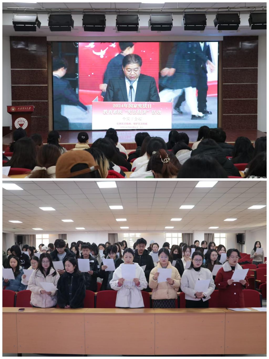 12月4日上午,组织学生在线参与第十一个国家宪法日教育系统“宪法晨读”活动,朗读中华人民共和国宪法的部分条文,集中观看第九届全国学生“学宪法 讲宪法”活动的优秀选手展演。与会师生深入理解宪法精神,感受宪法权威,纷纷表示要在日常生活中认真践行和维护宪法。