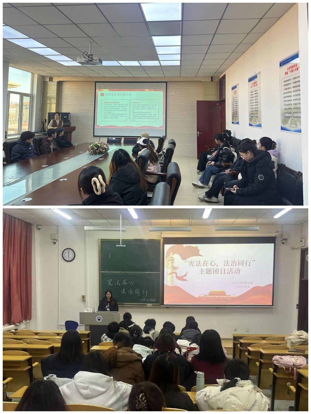 法学2302团支部召开了“宪法在心 法治同行”主题团日活动,通过分享宪法知识、讨论宪法在实际生活中的应用等方式,让同学们对宪法有了更直观和深入的了解。活动中,团员青年们共同观看宪法宣传视频,深化对宪法内核的理解;学院青萃法律服务中心推出了普法教育系列活动,以法条拼接诗、宪法知识竞赛、法律咨询服务等多元化的宣传教育载体,引导师生进一步深化宪法意识,积极弘扬宪法精神。